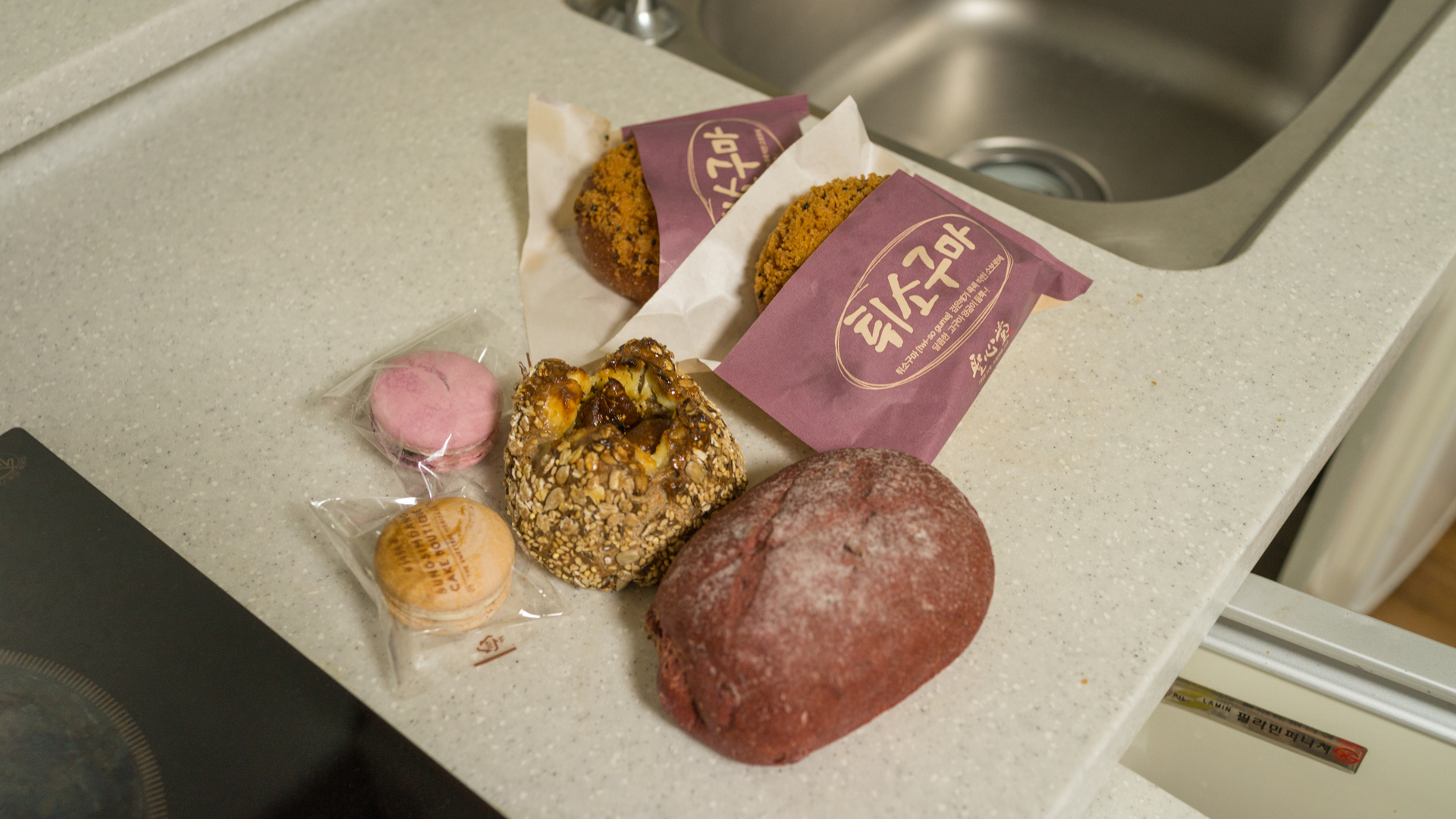 뭔가 지금 보니 빵도 좀 많은 것 같고, 숙취도 가라 앉힐 겸 마카롱과 튀소구마를 하나 집어 먹고 자리에 눕는다.