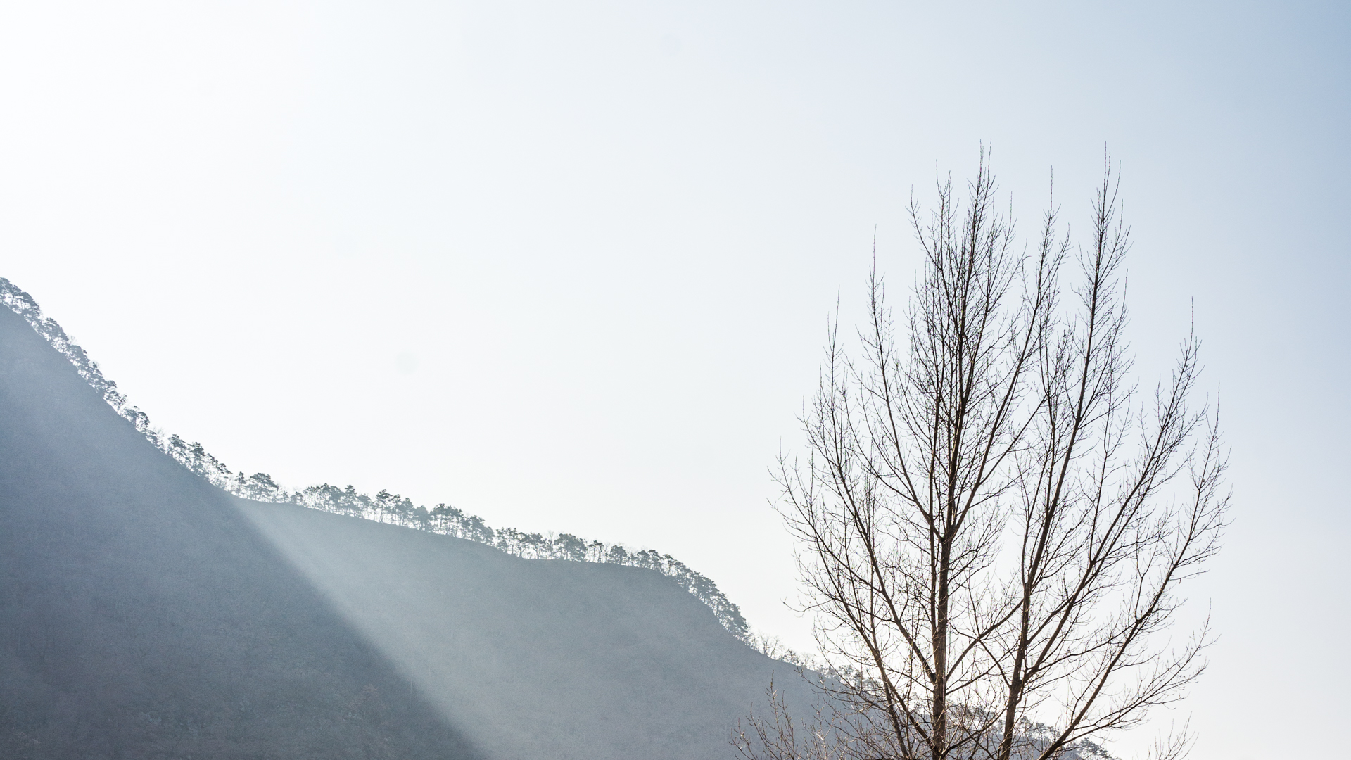 산 사이를 뚫고 나오는 햇빛이 나무에 걸리는 모습, 뭔가 겨울이라는 느낌이 물씬 풍겨 한 장 남겨본다.