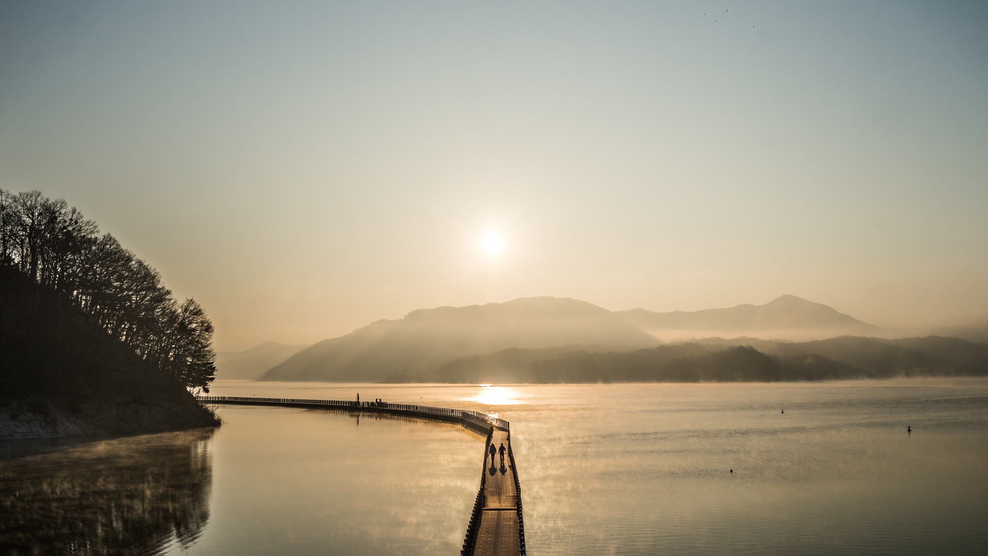 마침 겨울이라 낮게 떠서 길 위에 걸친 해, 산책 중이신지 길 위를 걸어가시던 부부.
