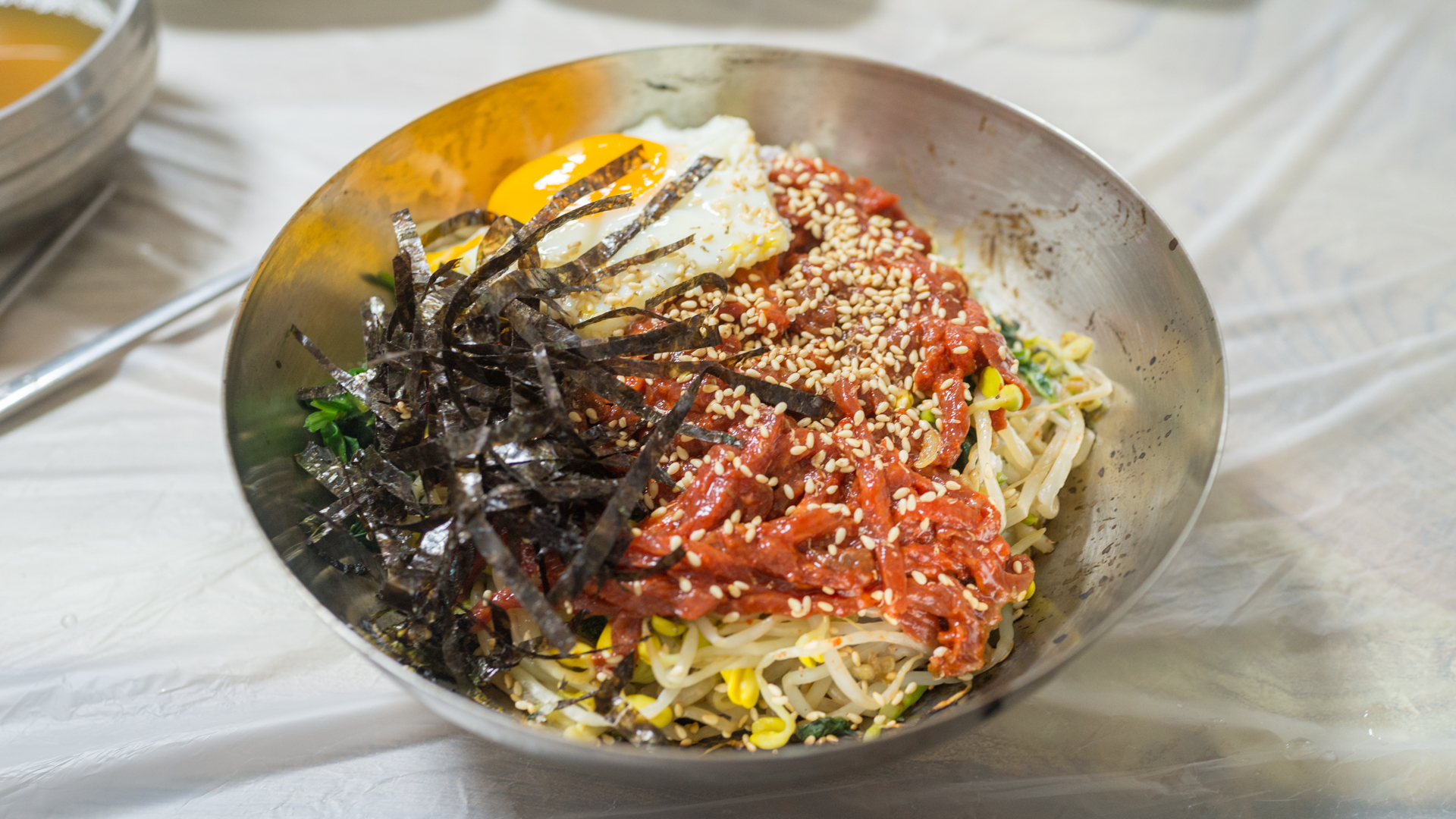 다시 속세에 돌아온 기념으로 깔끔하게 육회비빔밥을 한 그릇.
