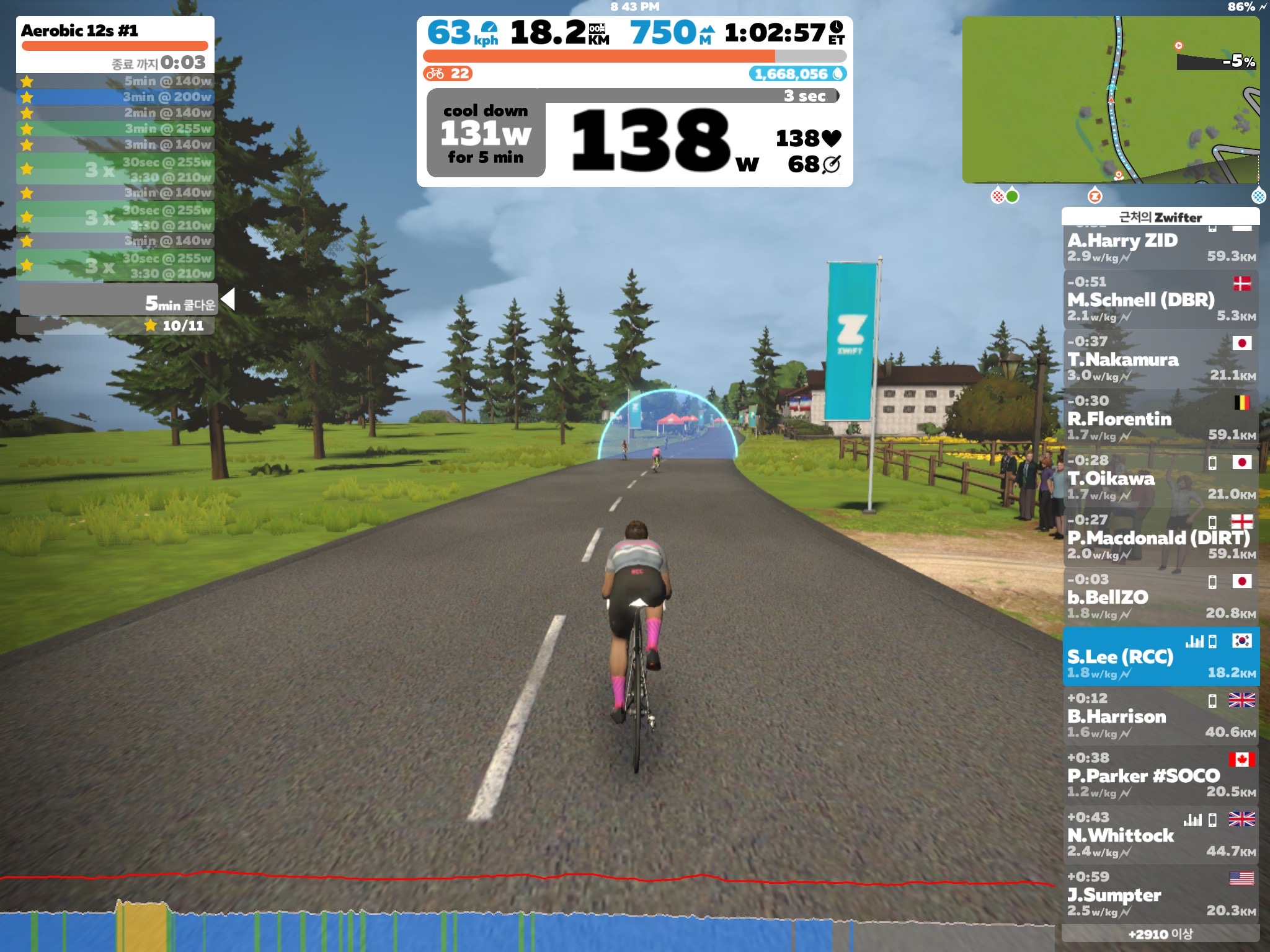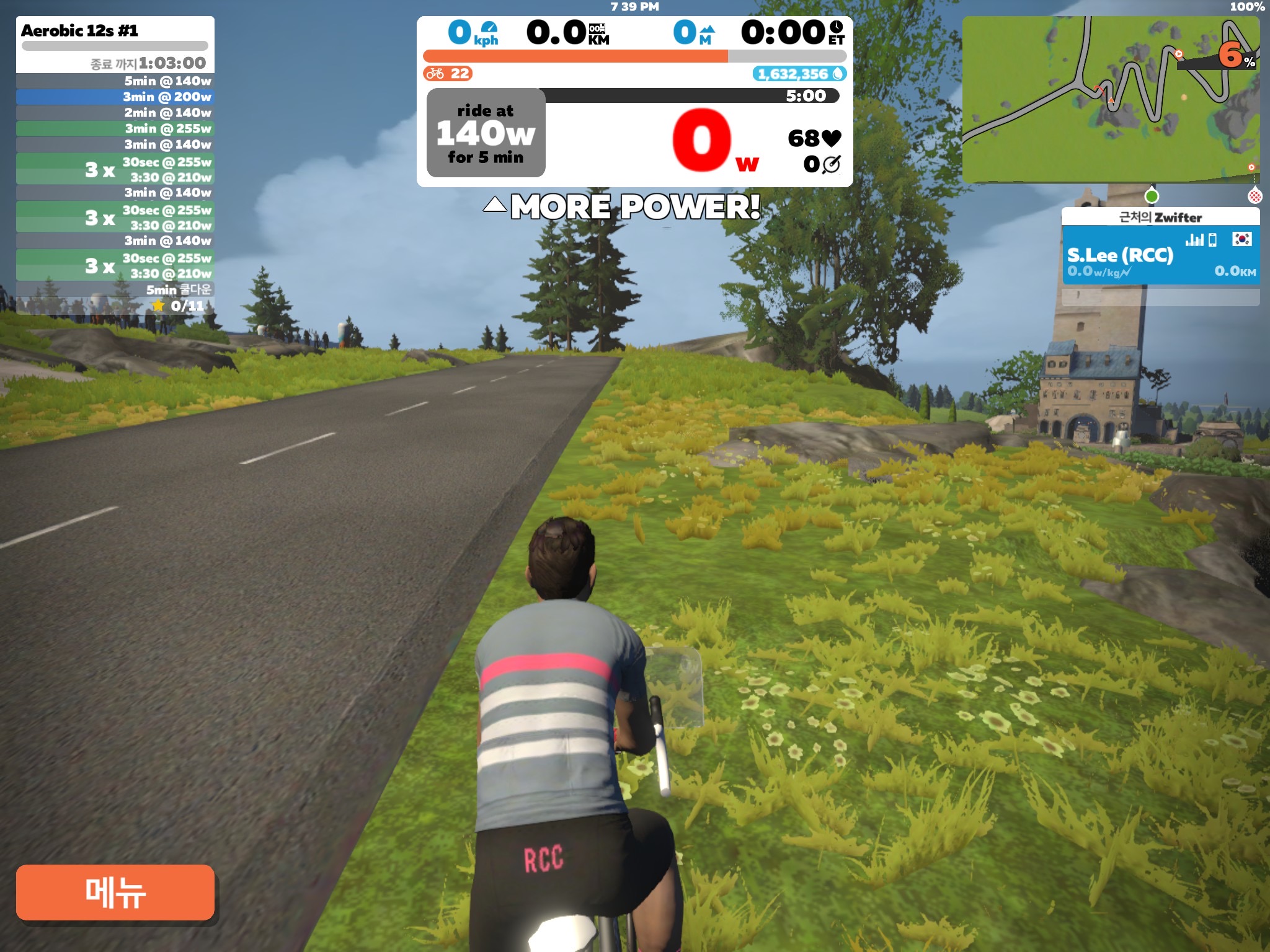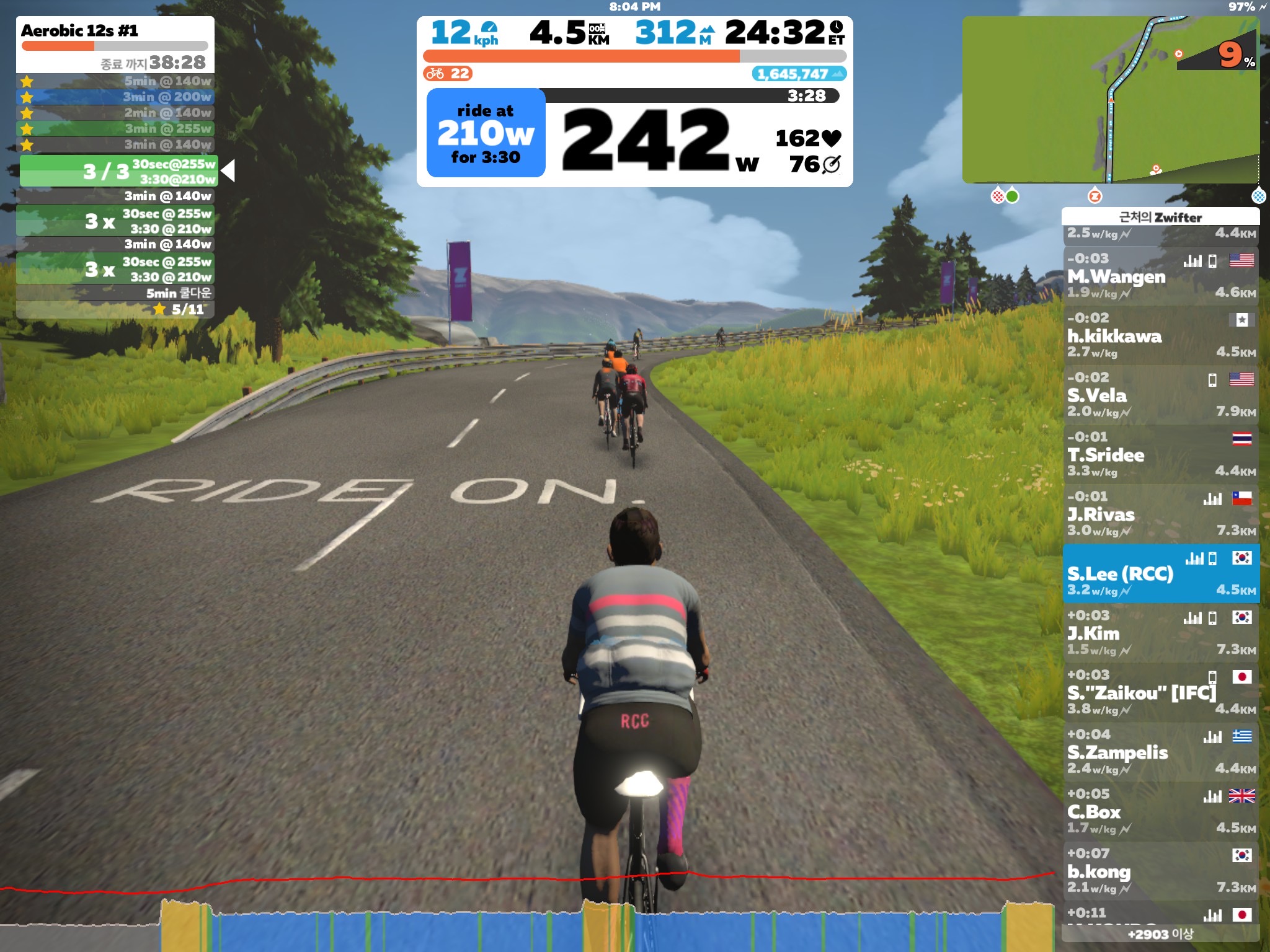255W를 돌릴 때 허벅지가 저릿하다. 원래 일요일에 쉬었어야 했는데 오히려 오버히트를 했으니...