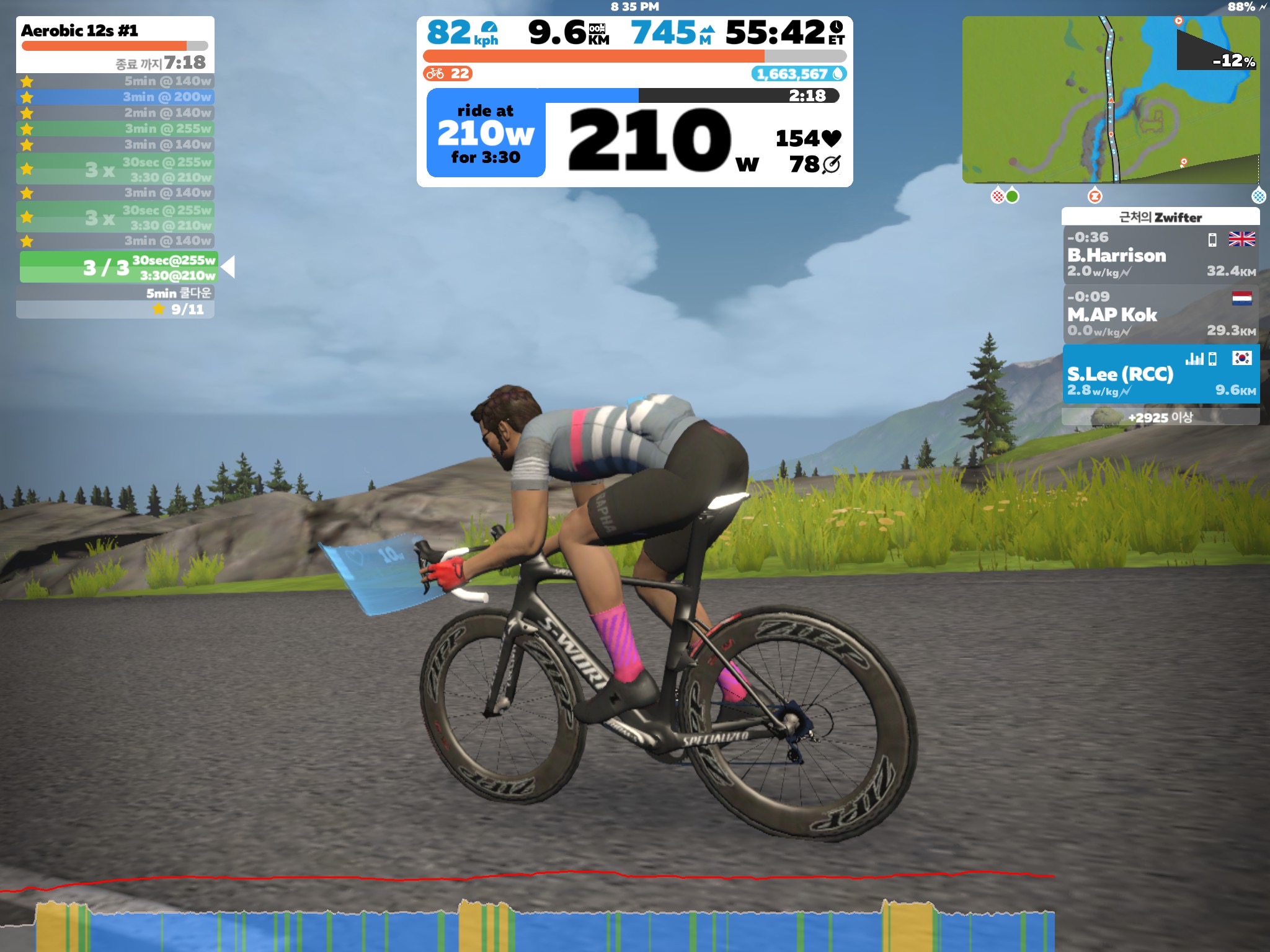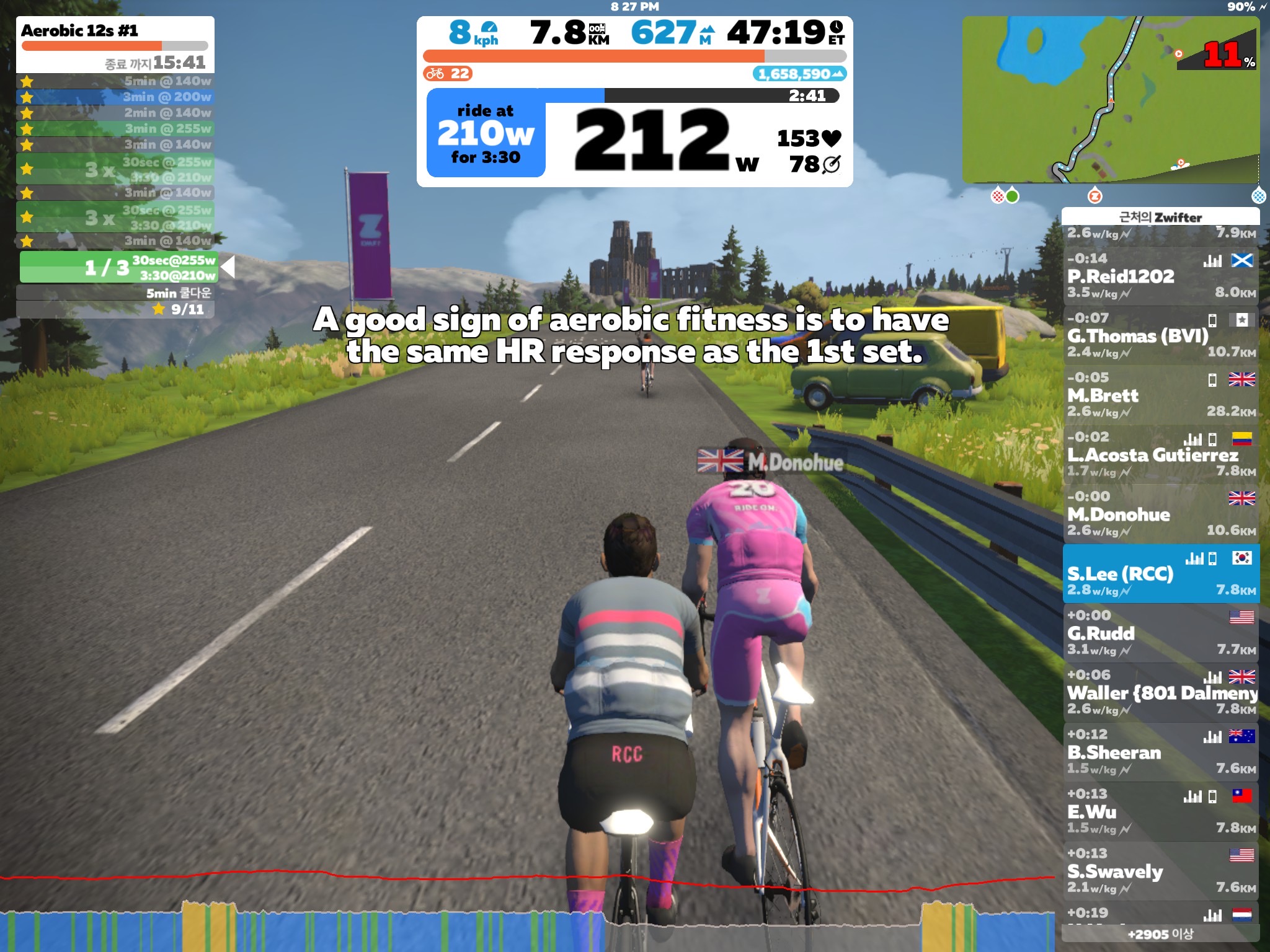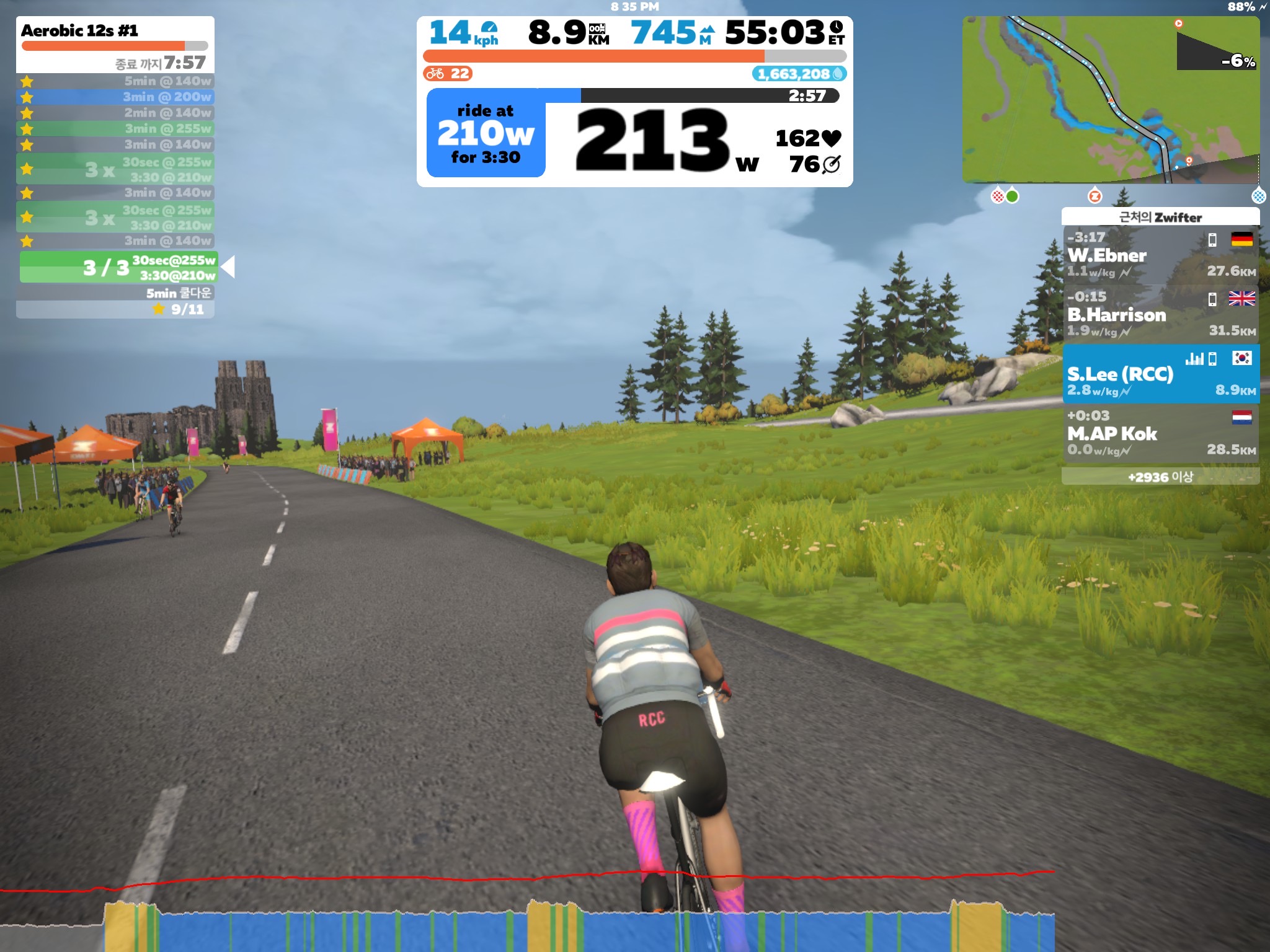 255W를 돌릴 때 허벅지가 저릿하다. 원래 일요일에 쉬었어야 했는데 오히려 오버히트를 했으니...