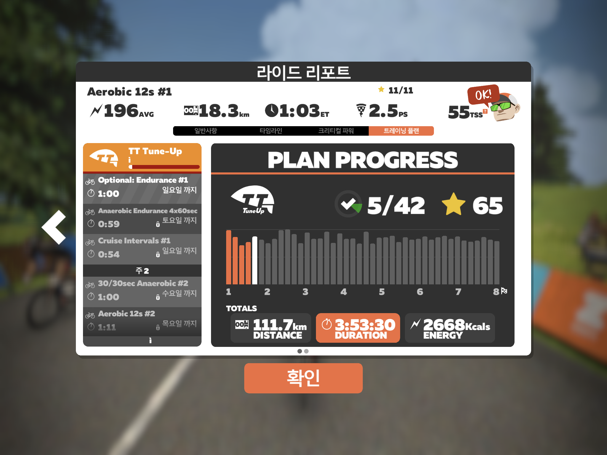 리포트를 보고 조금 놀랐다. 생각보다 칼로리 소모량도 많고, TSS도 50을 넘겼다.