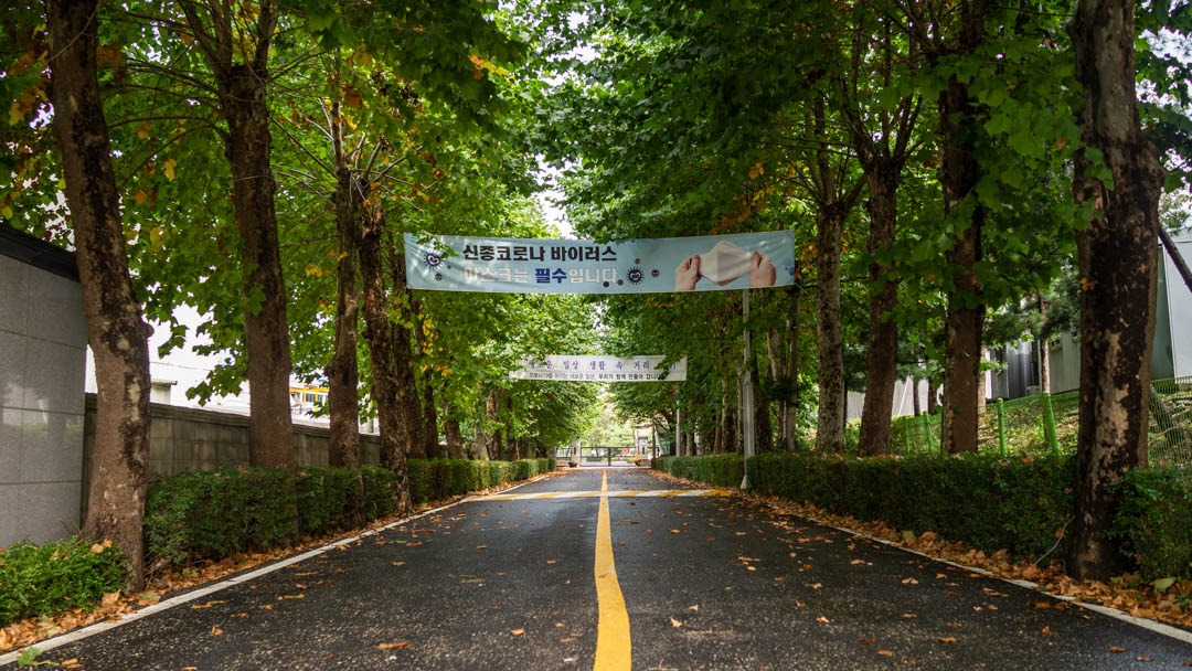 공장보단 조금 낮지만, 바로 옆의 고등학교 입구에도 조경이 쭉 이어져 보기 좋다.