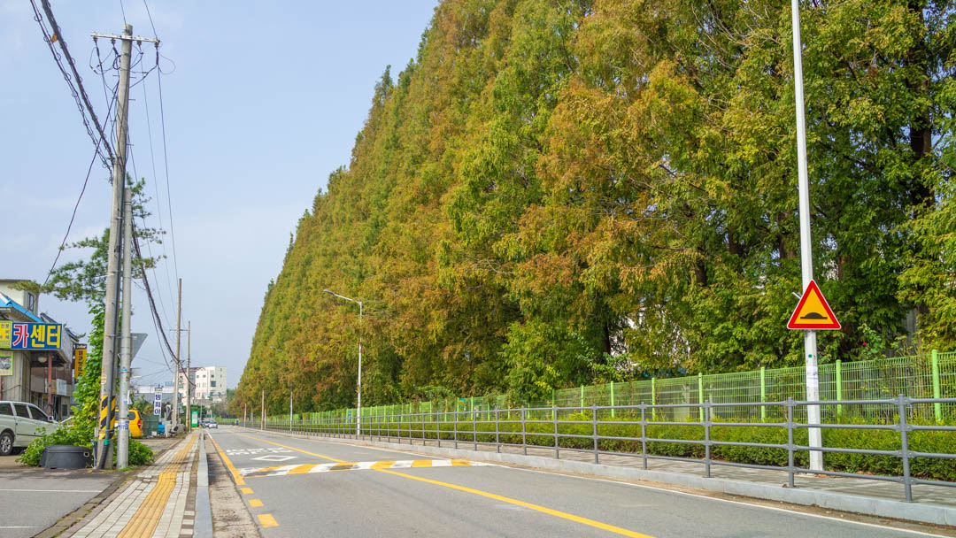 나중에 와서 지도를 보니 제지공장의 벽을 따라 쭉 심어놓은 나무였다.