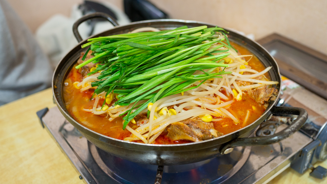 콩나물과 부추가 듬뿍. 평소 먹던 감자탕과는 느낌이 많이 다르네요.