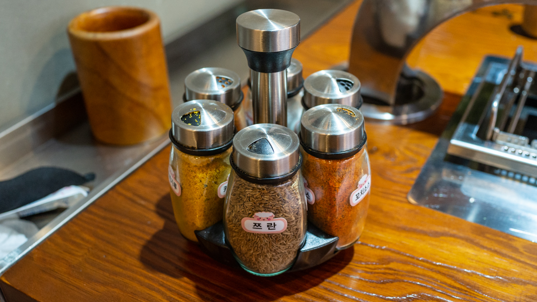 뭔가 카레가루도 있고... 저는 그냥 꼬치 소스에 쯔란이면 충분하기에 이 둘만 열심히 덜어 먹었습니다.