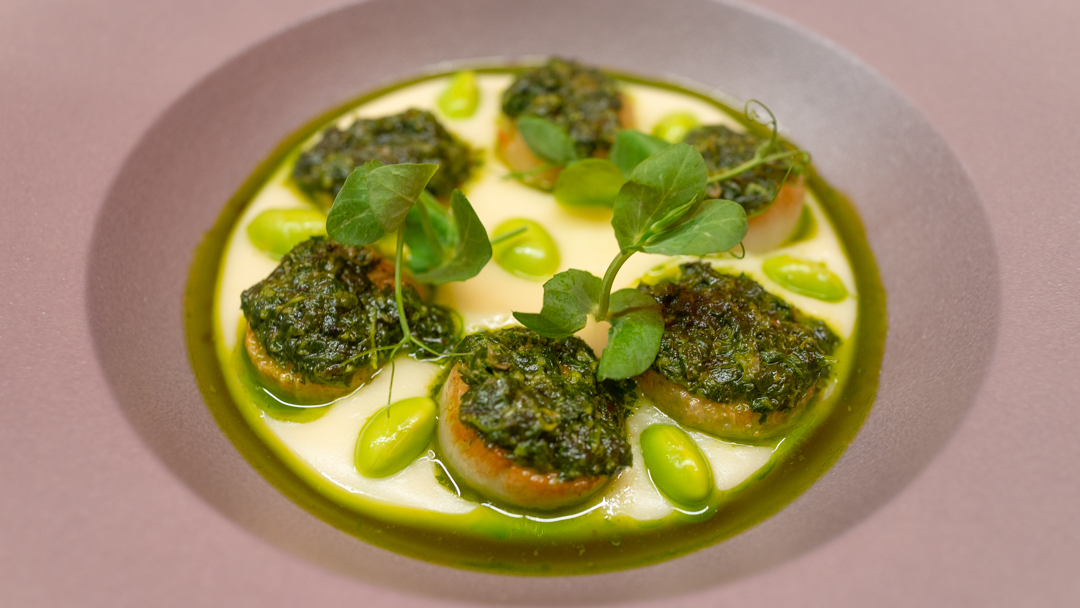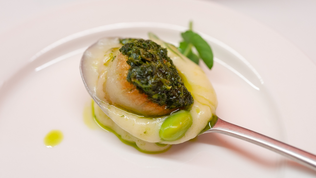 수저로 메쉬 포테이토와 살사바르데, 관자를 한 번에 떠서 입에 넣는데 맛이 너무 좋네요.