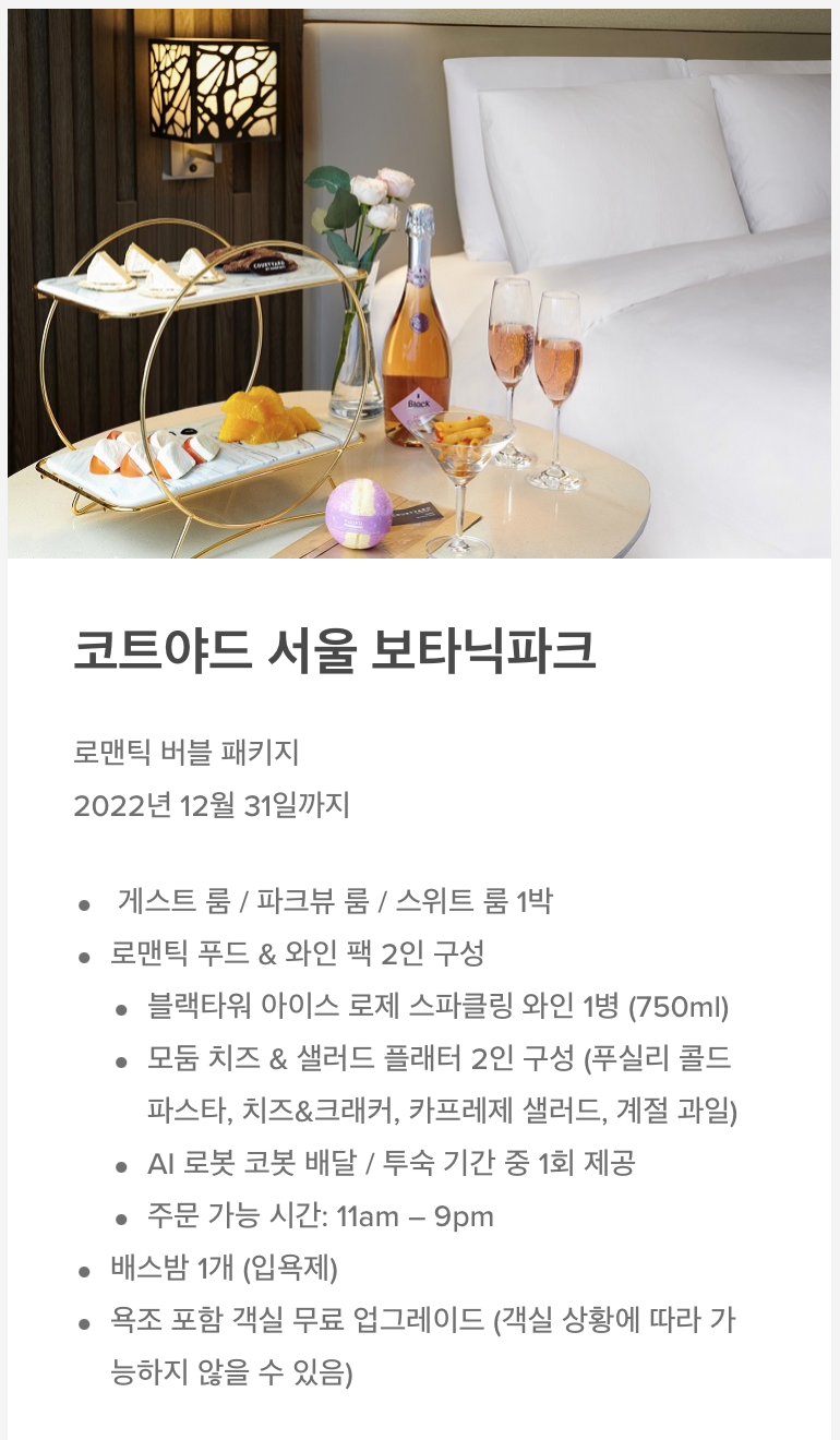 체크인 할 때도 직원이 욕조가 없는 객실을 예약했다고 하는데, 가능하다면 객실 업그레이드를 제공하는 패키지다.