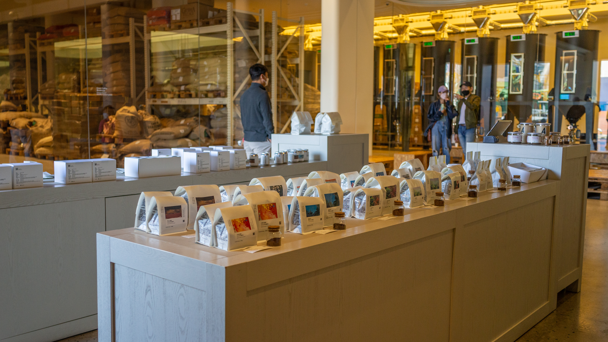 창고에는 여러 종류의 스페셜티 커피들이 한가득 쌓여있고, 매대에도 로스팅을 마친 콩들이 가득 있습니다.