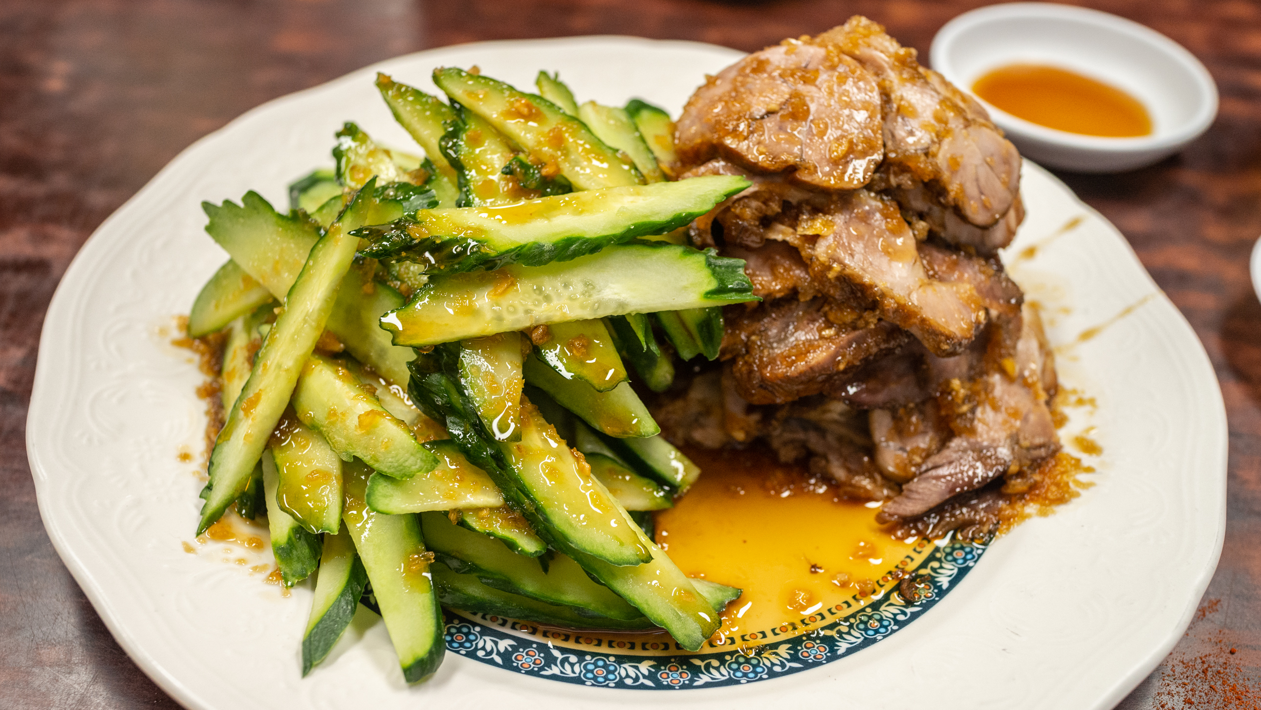 바로 나올 수 있는 오향장육을 한 그릇. 이것도 꽤 잘 나가는 메뉴인걸까요? 잠깐 열린 주방 틈 사이로 잔뜩 쌓인 오이가 보입니다.