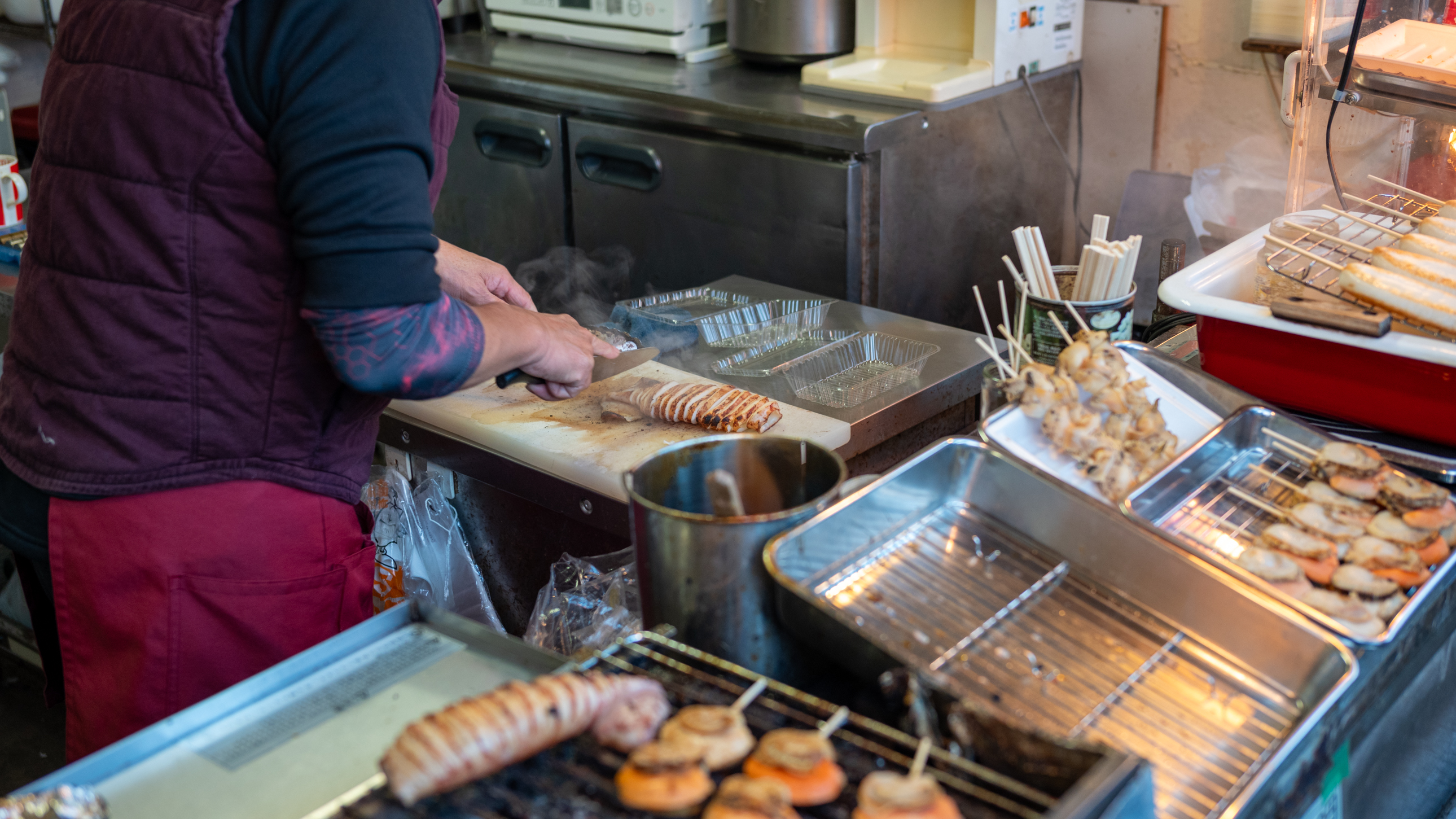 아까 넘어오는 길에 해물을 굽는 가게가 하나 있던데, 잠깐 들러봐야겠네요.